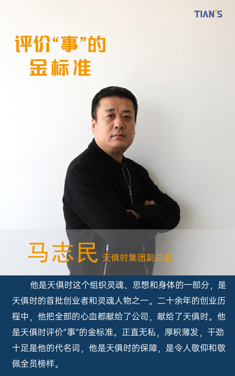不馳于空想、不騖于虛名。發布天俱時集團金標準榜樣人物是為了更好的弘揚天俱時精神,傳承天俱時文化,讓我們銘記組織輝煌發展史中里程碑式的英雄人物及其事跡,心懷夢想,追光而行;傳承“金標準”奮斗的責任擔當,乘風破浪,揚帆遠航。