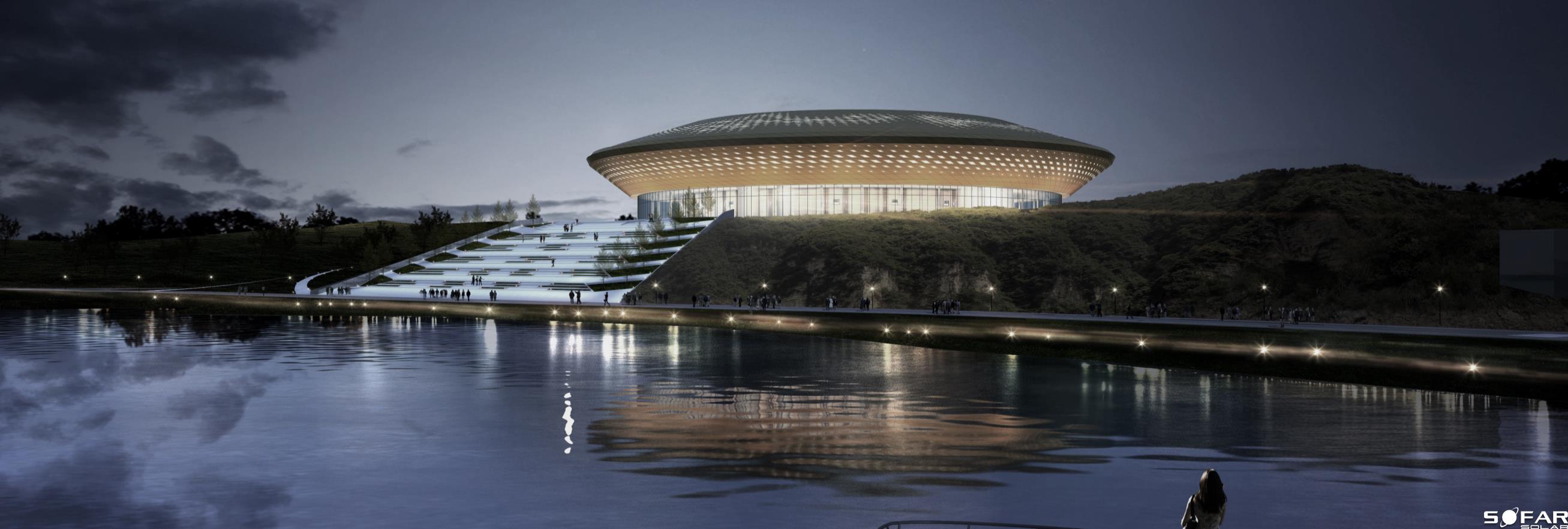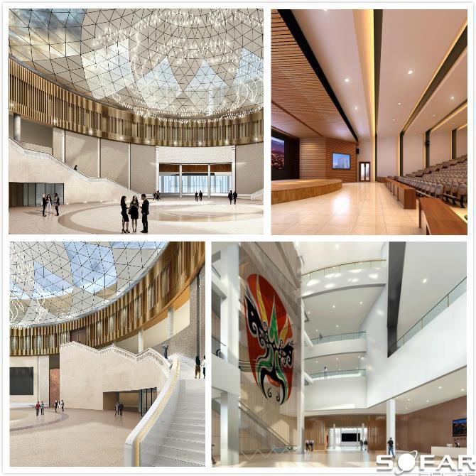 淮州新城國際會展中心采用圓形作為基本形體,通過透明玻璃幕墻從底部托起,營造出建筑整體懸浮半空的姿態(tài),形似“UFO”飛行器。主要分為展覽中心、會議中心、航空博物館和設備用房及庫房等輔助功能區(qū)三部分功能分區(qū)。一層為展廳,服務于未來航空產(chǎn)業(yè)產(chǎn)品的展覽,二三層為會議功能區(qū),服務于大型航空產(chǎn)業(yè)會議的召開,四層為航天博物館。未來,淮州新城國際會展中心將成為淮州新城通用航空產(chǎn)業(yè)對外展示的窗口。