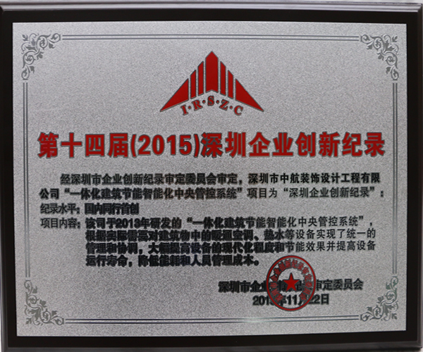 ? ? 2016年1月8日,第十四屆深圳企業(yè)創(chuàng)新記錄成果發(fā)布會在五洲賓館舉行。大會共審定“深圳企業(yè)創(chuàng)新記錄”147項,其中由我公司自主研發(fā)的“隔音裝飾板”項目和“一體化建筑節(jié)能智能化中央管控系統(tǒng)”項目紛紛獲獎。