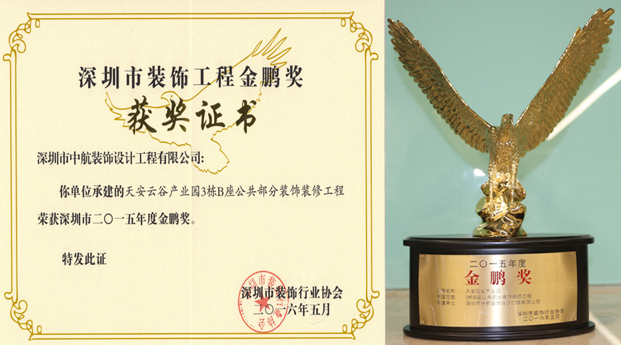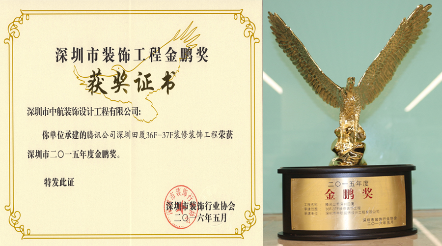 ? ??多年來,中航裝飾集團不斷強化專業(yè)技術工藝,工程質量和工程品質穩(wěn)步提升。中航裝飾注重品牌建設,更注重品質建設,我們堅信只有提升品質,才能增創(chuàng)效益。深圳市裝飾工程金鵬獎是深圳裝飾工程領域的權威評選,這份榮譽的獲得是業(yè)界專家對我公司裝飾裝修工程優(yōu)秀品質的充分認可。我們珍惜這份榮譽的獲得,更希望將這份榮譽載入中航裝飾的史冊,使之延續(xù)并發(fā)揚光大!