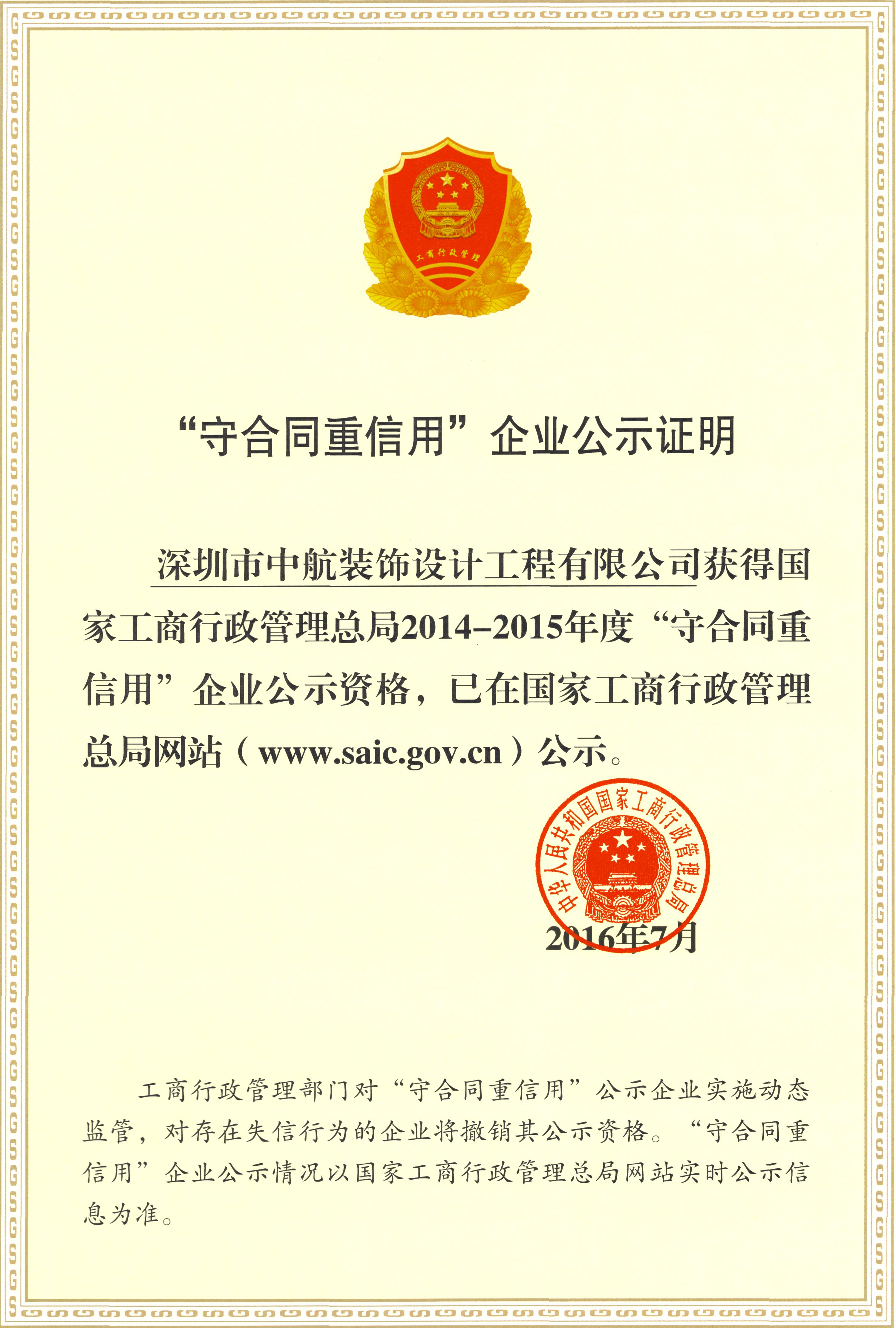 近日,國家工商行政管理總局“全國守合同重信用企業”評選結果揭曉,中航裝飾集團獲此殊榮,成為2014-2015年度國家級“守合同重信用”企業。