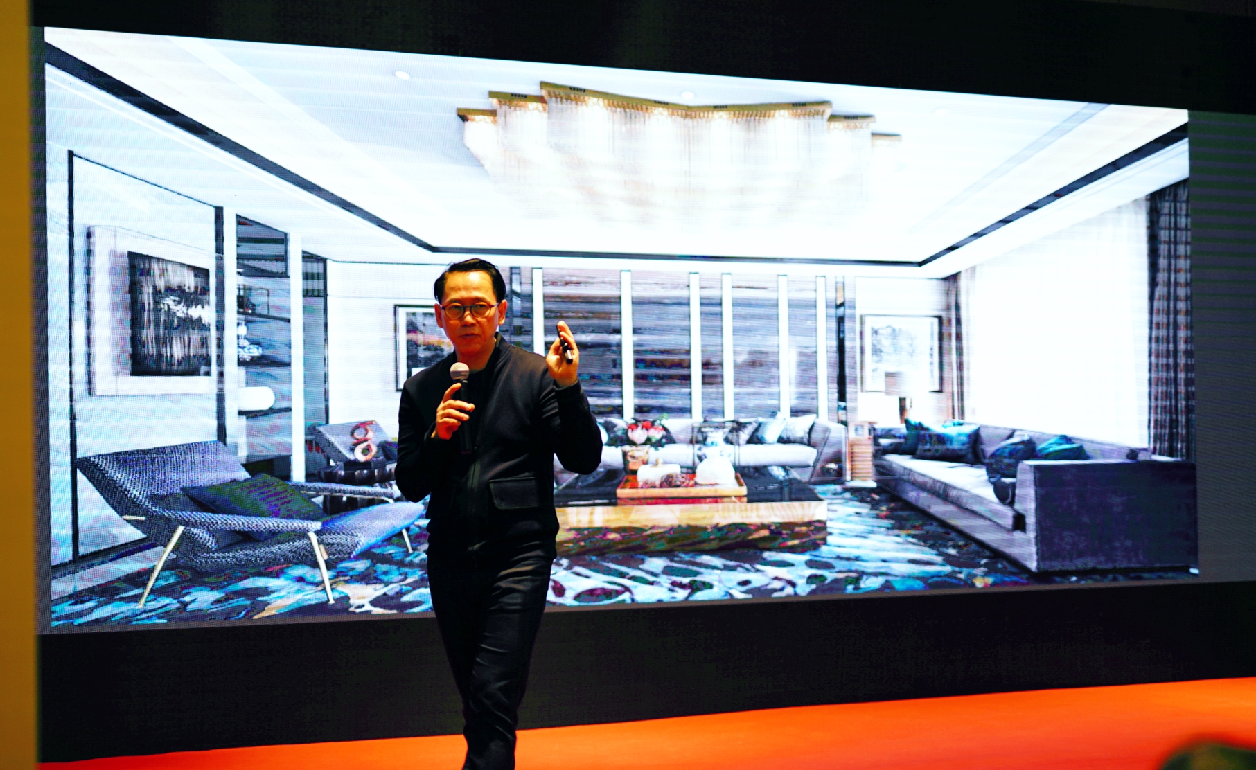 隨后,特邀嘉賓梁景華先生重點圍繞設計理念及經典案例進行了精彩的分享,受到與會設計師的高度關注和熱烈歡迎,引發了全場的首次思想碰撞。梁景華先生的室內設計作品追求永恒、創意,以簡約、精巧見長,擅于融合東西方文化精髓,創造出和諧、舒適和不受時空限制的人居空間。