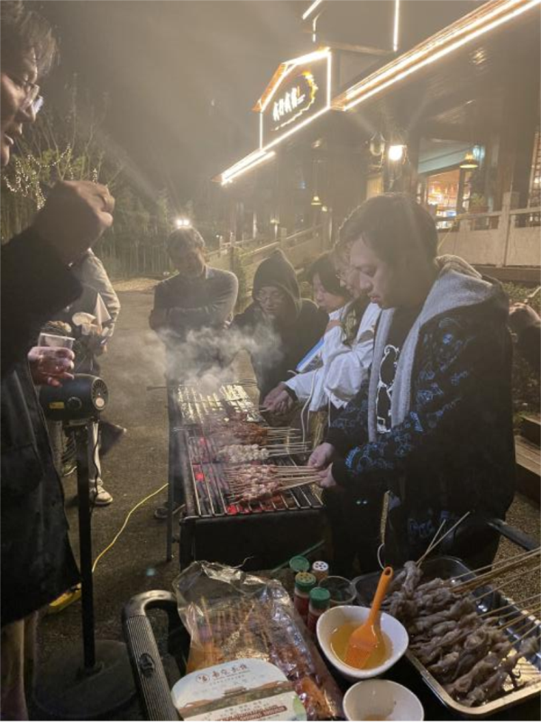 美景與美食,都是旅途當中不可缺少的元素。在此次行程中,令人最印象深刻的就是晚上的那一場自助燒烤了。我們印象中的燒烤就是廚師用著熟練的燒烤手勢,刷油,翻肉、撒孜然,最后問你要不要辣。但是到了我們自己手中,卻截然不同,我們生火燒炭就足足少了半個多小時。當然除了生火,困難一個接著一個,比如大家在烤肉的時候被煙熏火燎,小伙伴們想到用電扇反方向吸煙吸熱,讓大家燒烤環境更好;再有就是在烤肉的過程中肉很快會烤焦,小伙伴就把烤爐分成3個區域,生的直接烤制,快熟的放錫紙上,已經熟了的只放錫紙下面不放煤炭??镜南衲O駱?,鮮美可口。