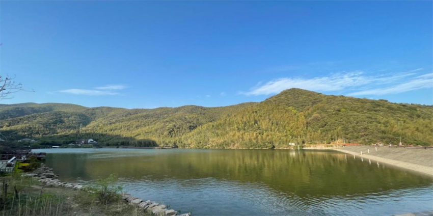 顧渚水庫原名叫“霸王湖”,整個水庫四面環山,現在正值早春,樹木蔥郁、翠竹成林。一汪碧藍的湖水在陽光的照射下,閃耀著粼粼金光,更猶如鑲嵌在竹海中央的藍寶石。走在為游客修建的湖邊堤壩上,放聲大喊亦或者是享受安靜都是絕佳的選擇。