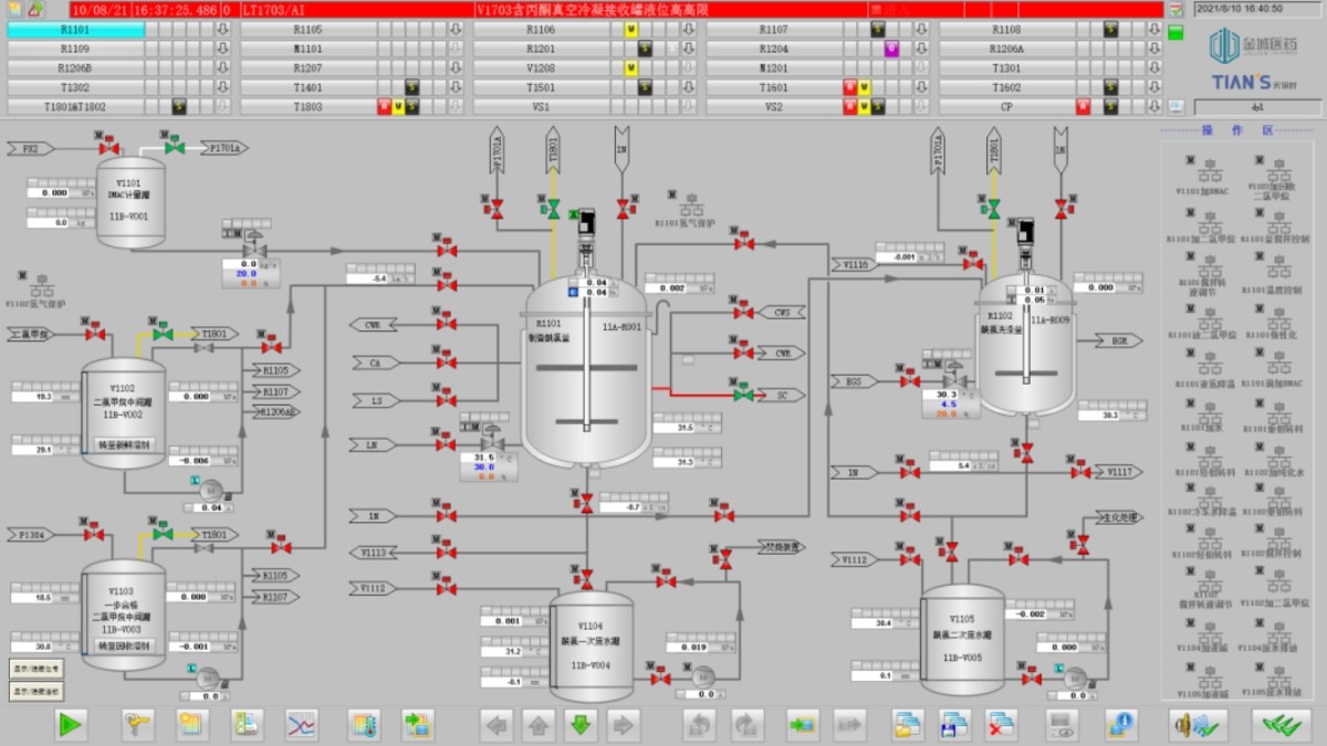 本項目中采用的雙滴加自動控溫、自動分相、稱重自動濃縮、PH自動控制以及配套回收系統全自動一鍵啟車等一系列先進的合成工藝控制技術,并且所有過程數據自動儲存,可隨時調取查詢,保證生產過程數據完整性、可追溯性,成功助力自動化生產。多種技術的應用讓該項目工藝參數控制更加精準,減小了人為操作與干預,增強了生產過程中的可控性,實現了自動化工廠新理念。